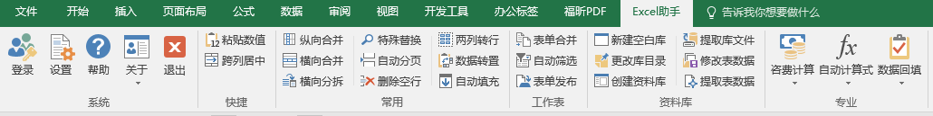 Excel助手软件分为6个组,系统、快捷、常用、工作表、资料库、专业: